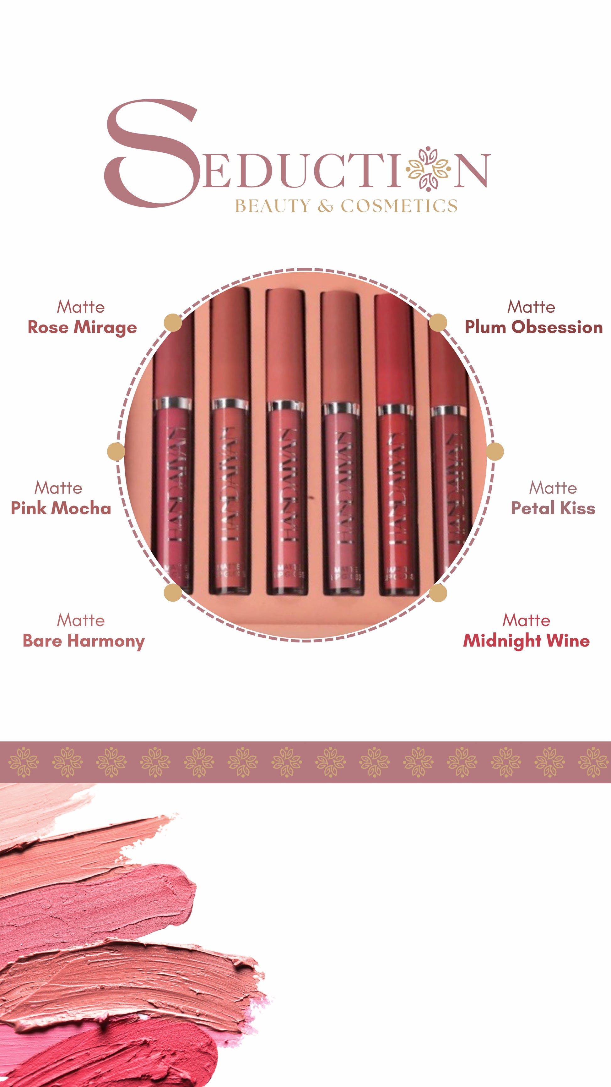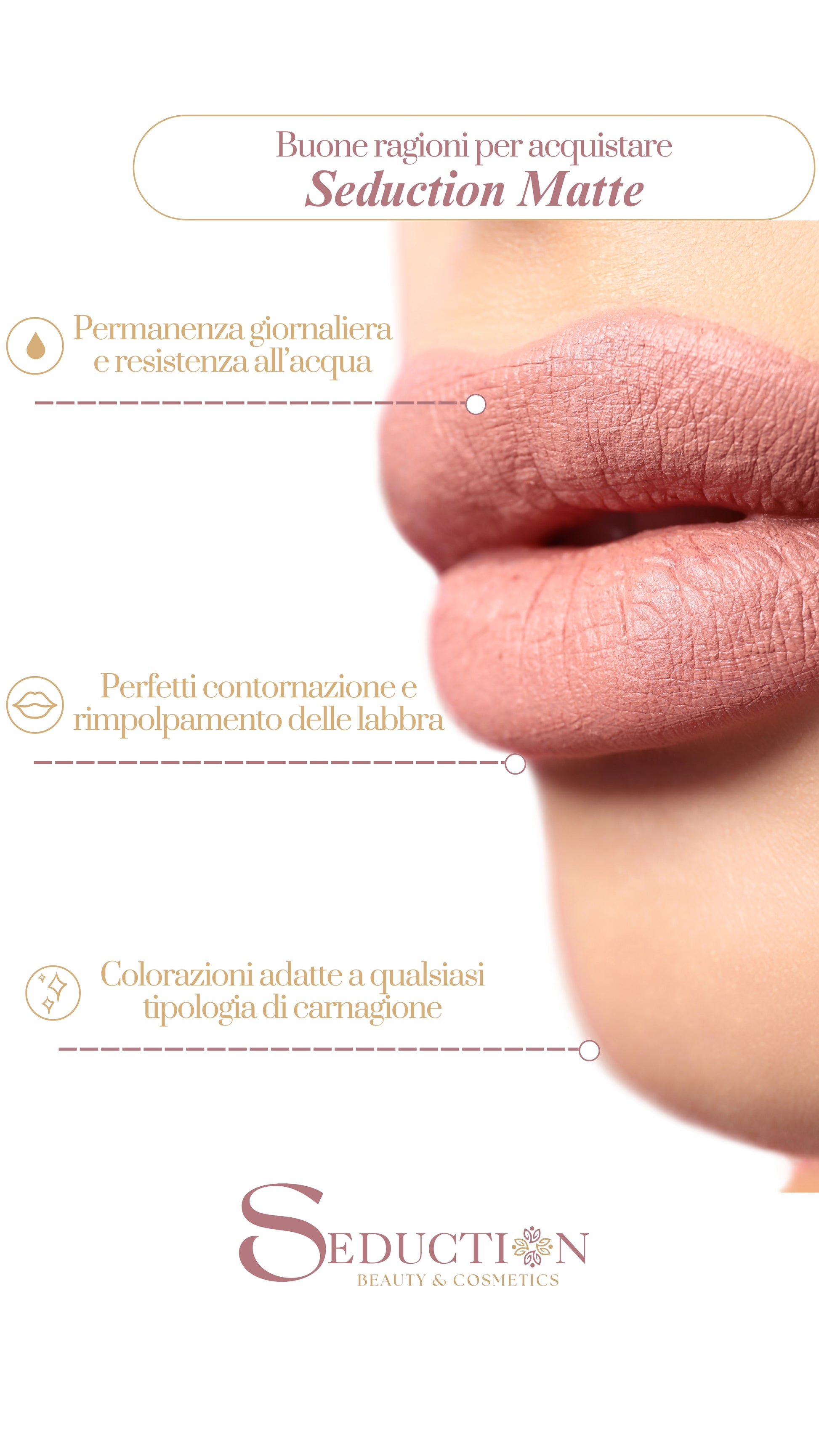 Seduction è il rossetto opaco che regala un colore intenso e una finitura vellutata. La sua formula a lunga durata idrata e definisce le labbra, offrendo comfort tutto il giorno. Per un sorriso irresistibile e un look audace che non passa inosservato.